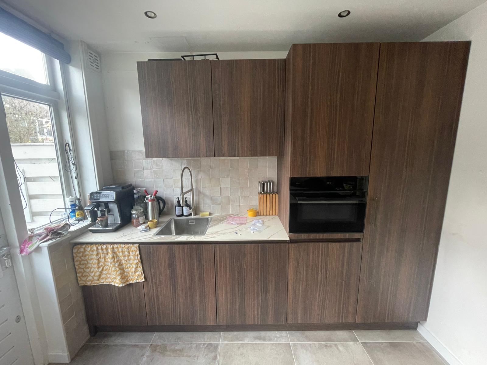 Voor dit project hebben wij de complete keukenrenovatie verzorgd. De werkzaamheden bestonden uit het verleggen van elektra en afvoeren, het betegelen van vloer en wanden en het vakkundig plaatsen van de nieuwe keuken.