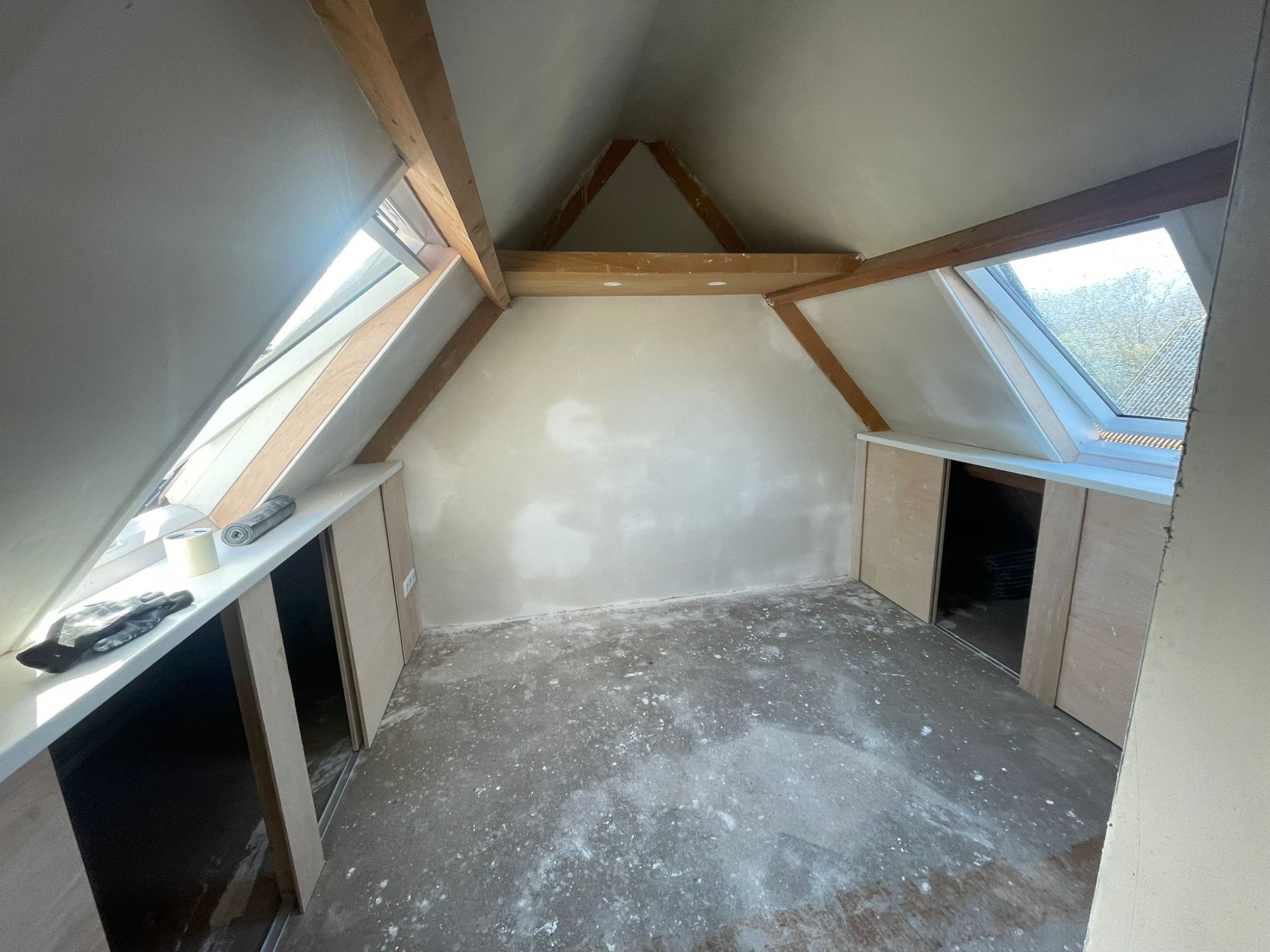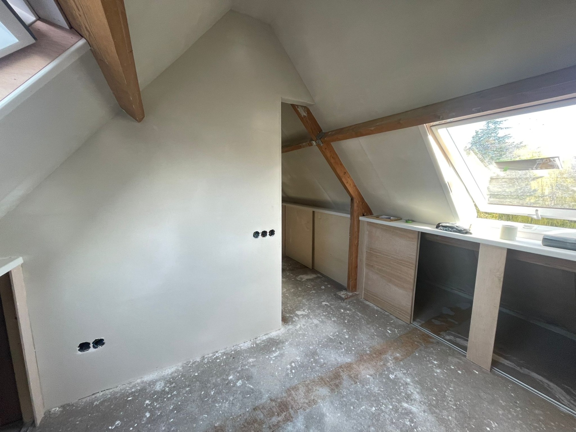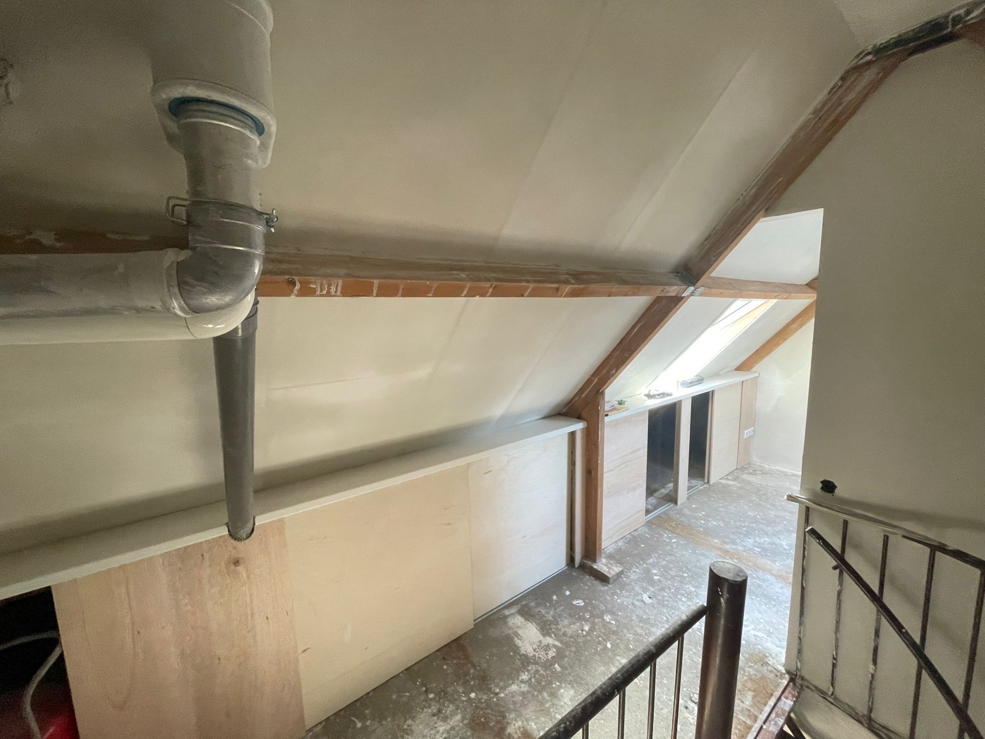 Zolderrenovatie uitgevoerd met maatwerk timmerwerk, volledig vernieuwde elektra en strak stucwerk. De ruimte is omgetoverd tot een lichte, functionele verdieping.