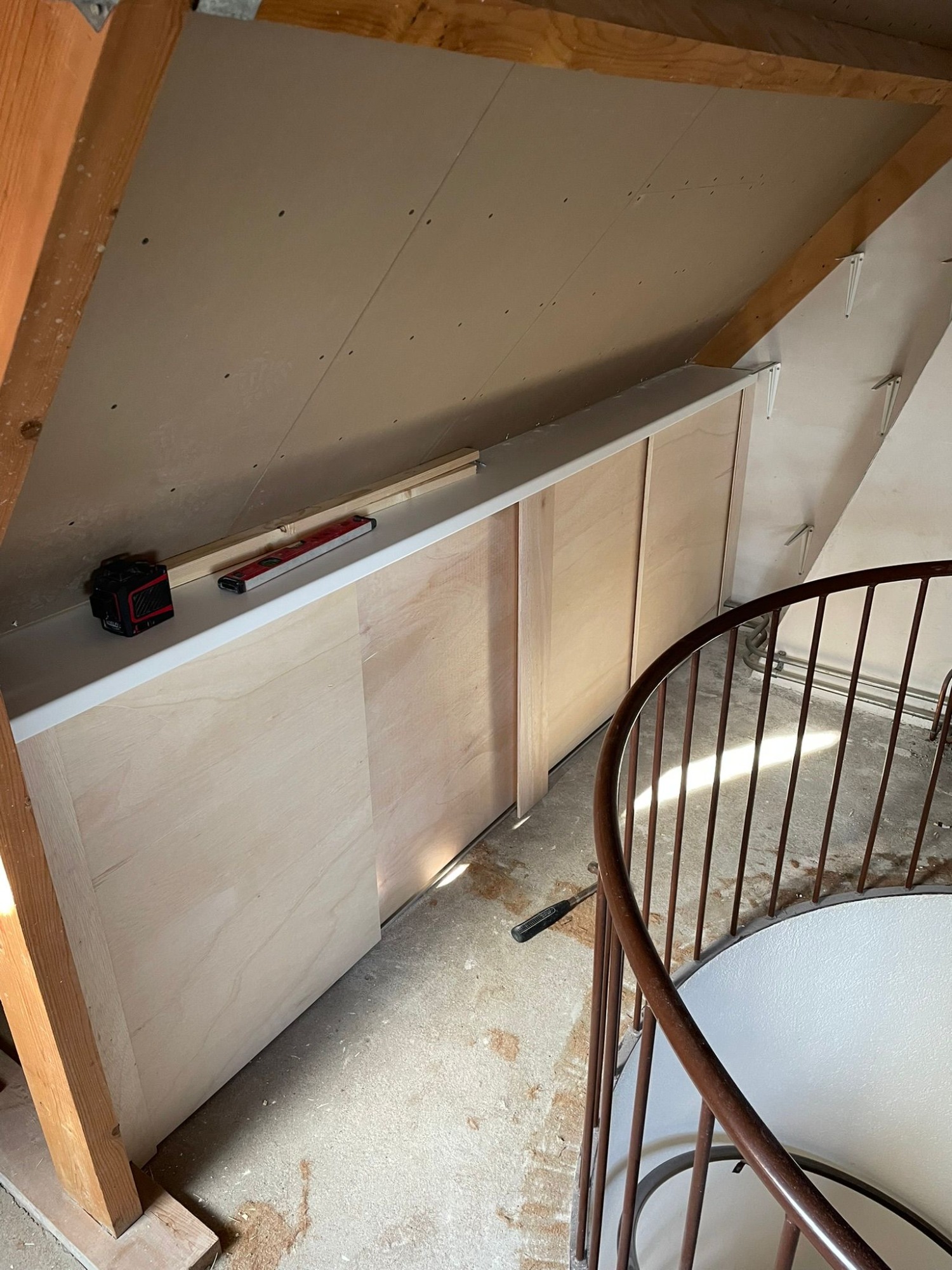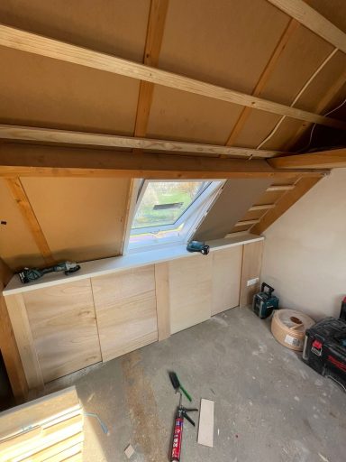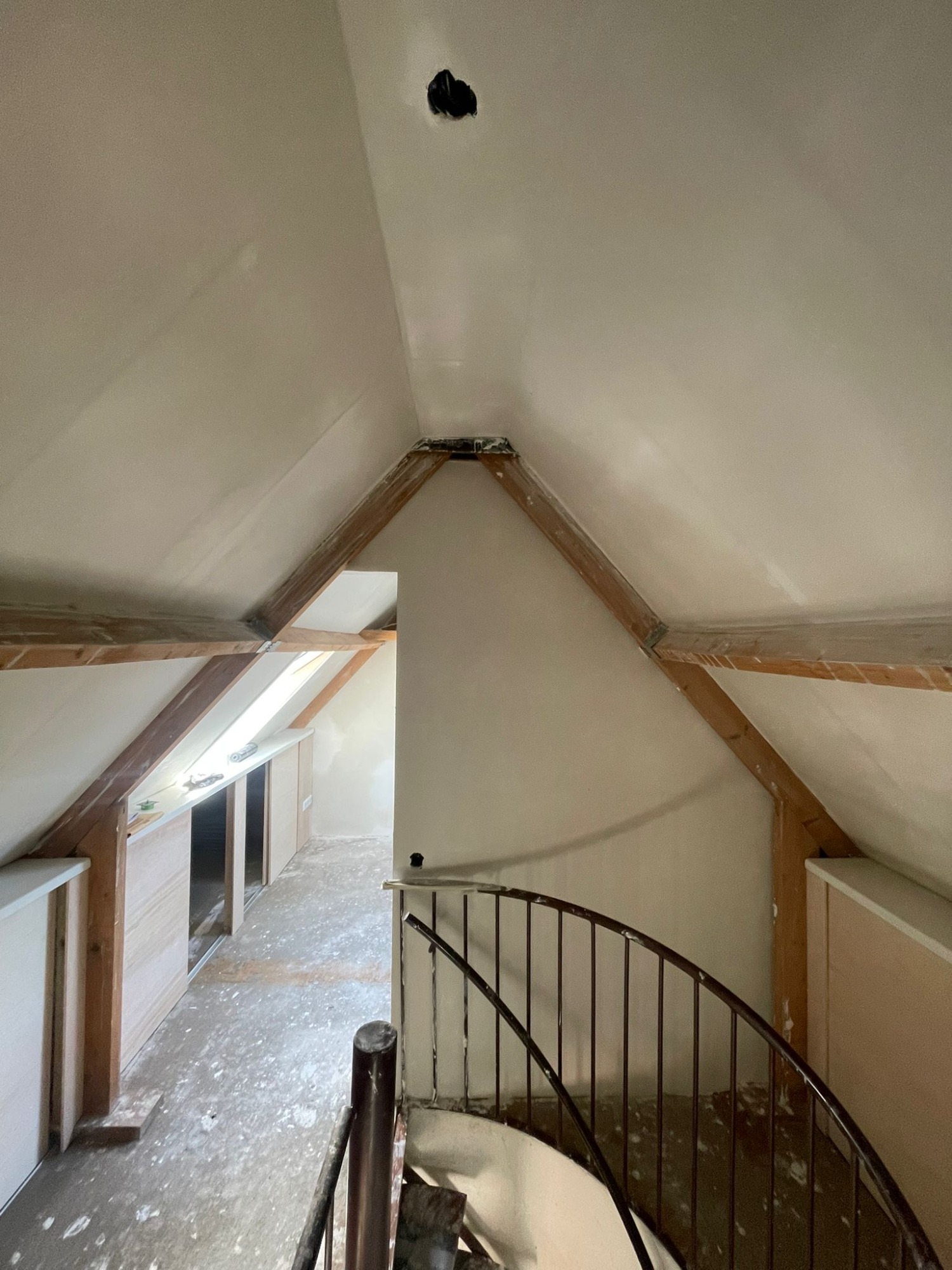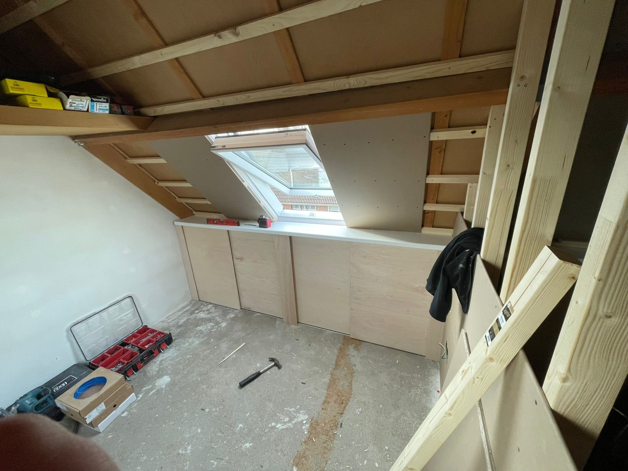 Zolderrenovatie uitgevoerd met maatwerk timmerwerk, volledig vernieuwde elektra en strak stucwerk. De ruimte is omgetoverd tot een lichte, functionele verdieping.